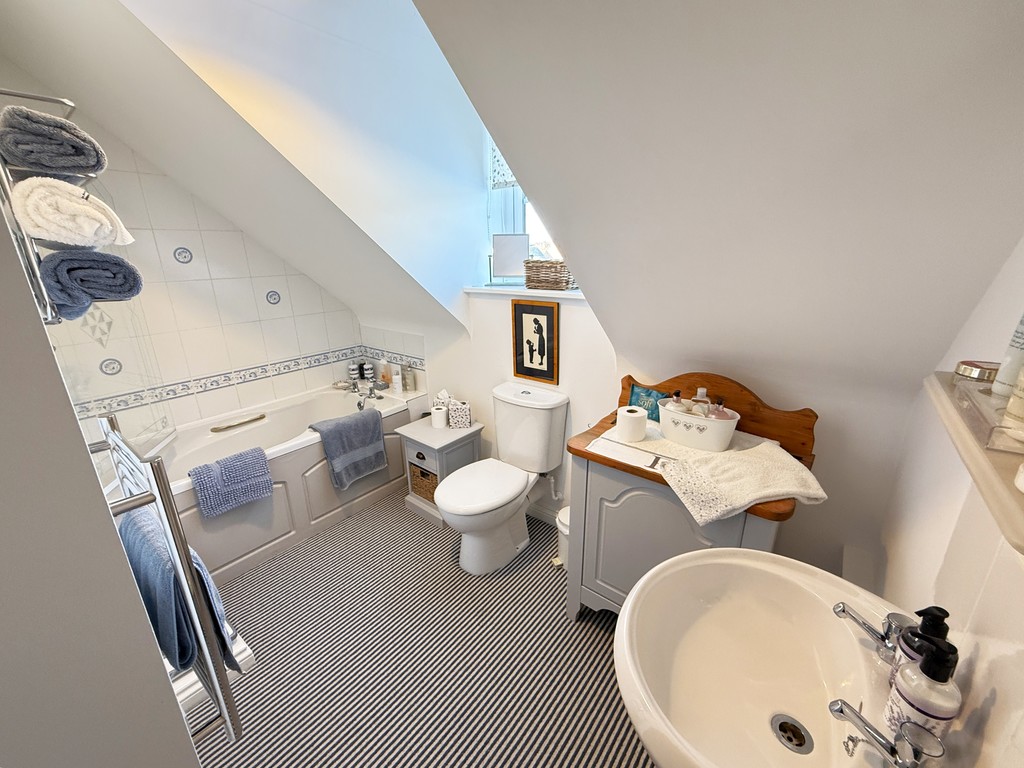 ENSUITE BATHROOM 9' 7" max x 5' 5" min (2.92m max x 1.65m min) Mostly textured & coved ceiling, UPVC double glazed dormer window to rear, electric wall heater, chrome heated towel rail. Suite comprising; panelled bath with tiled splash-back and fitted system mixer shower over, pedestal wash hand basin with tiled splash-back, low level WC.