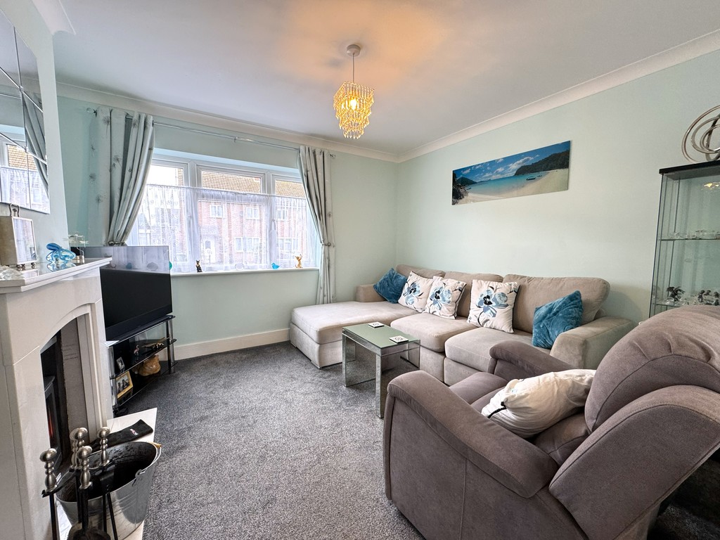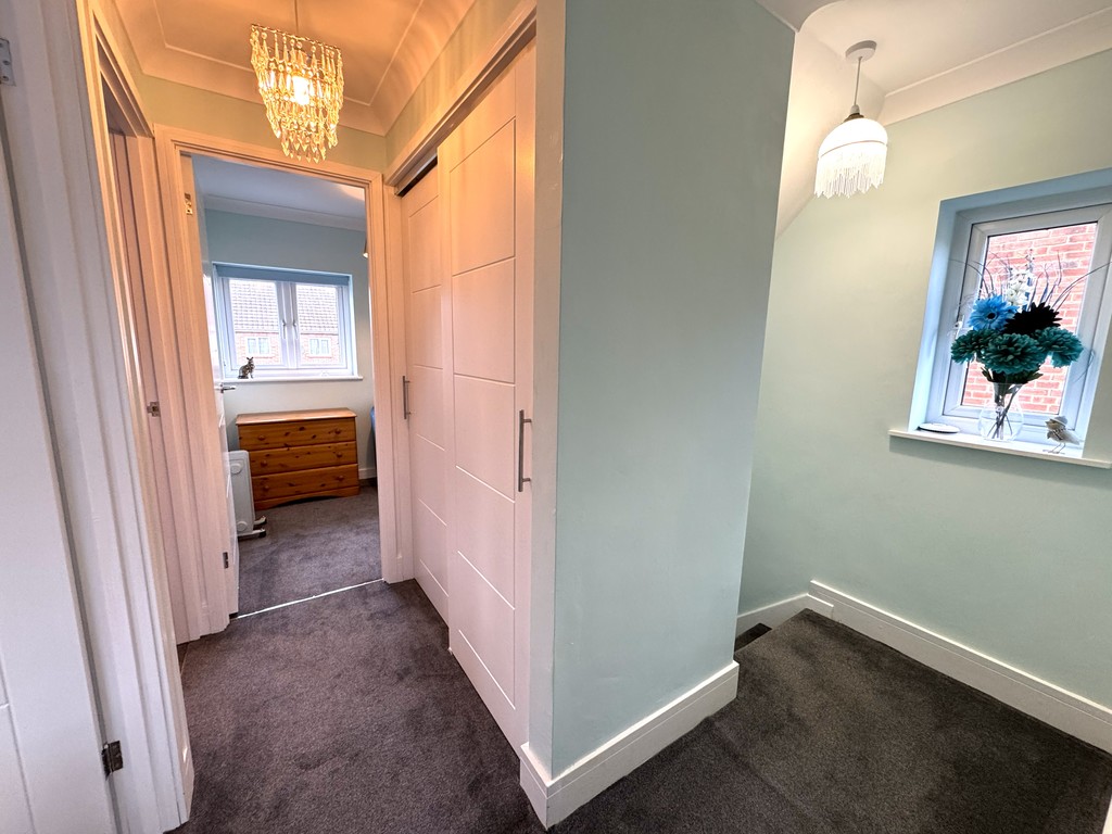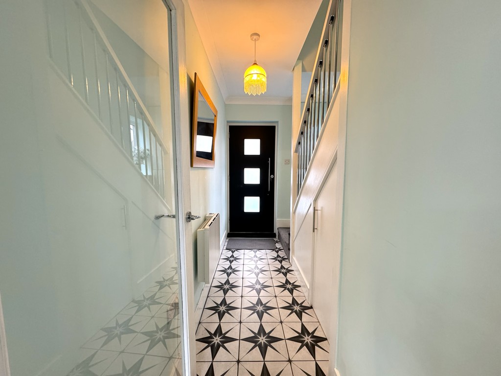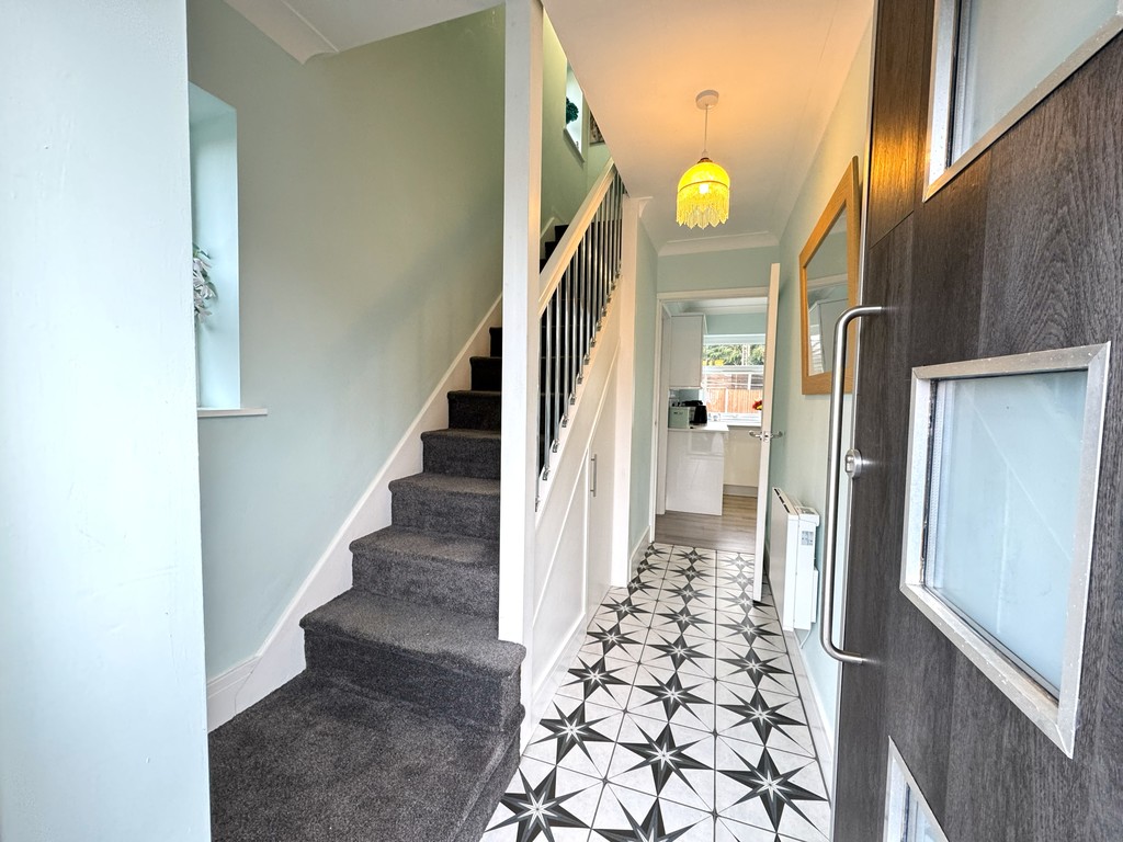 Entrance Hall With composite door, UPVC double glazed window, electric radiator, cupboard housing consumer unit & electric meter, tiled floor, stairs to first floor landing with banister & chrome spindles, understairs cupboard, skirting, coving and skimmed ceiling.