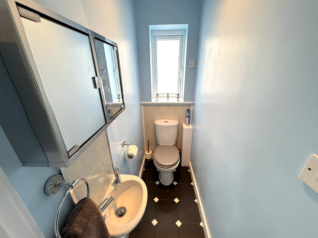 Downstairs WC With low level WC, wall mounted hand basin with splashback, tiled floor, UPVC double glazed window, skirting, coving and skimmed ceiling with inset spotlight.