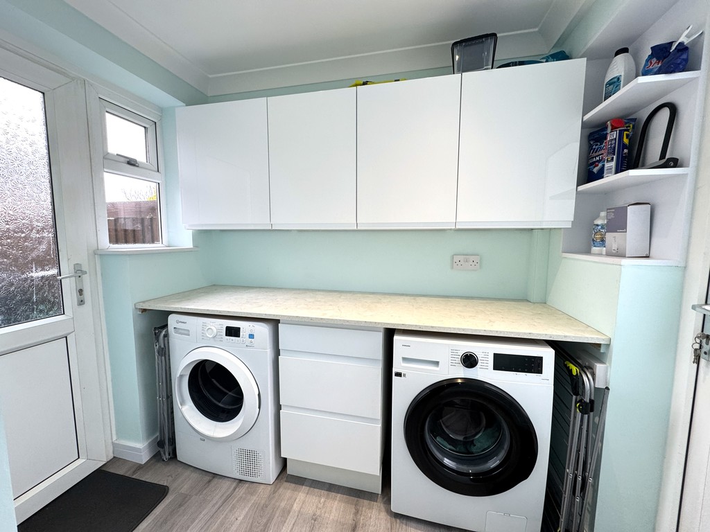 Utility Room 7' x 5' 1" (2.13m x 1.55m) With contemporary fitted wall & base units, fitted worktops, point & space for a washing machine, space for a tumble dryer, UPVC doors to front & lean-to conservatory, cupboard, skirting, coving and skimmed ceiling with inset spotlights.