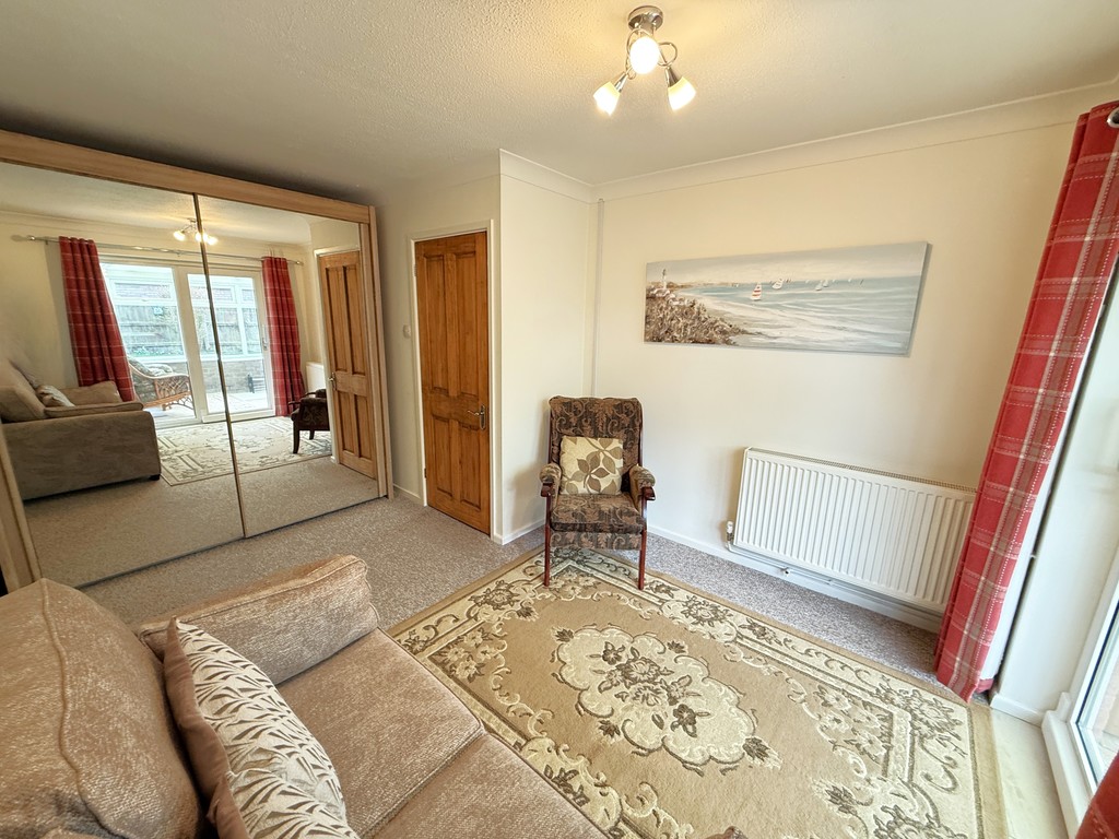 BEDROOM ONE 14' 2" max x 7' 2" min opening to 9' 11" max (4.32m max x 2.18m min opening to 3.02m max) Textured and coved ceiling, power points, double radiator, wardrobe with sliding mirrored doors. UPVC double glazed slide and tilt door to conservatory.