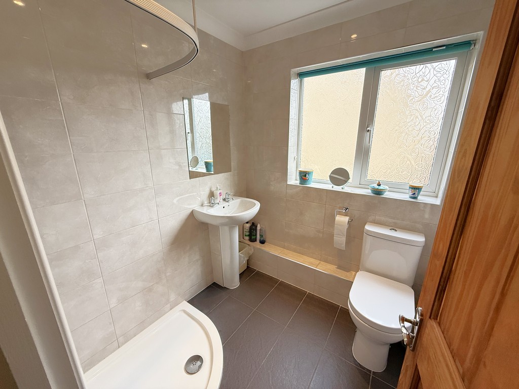 SHOWER ROOM 5' 11" x 5' 10" min (1.8m x 1.78m min) Skimmed and coved ceiling with inset spot lights, ceiling extractor, tiled floor, UPVC double glazed window to side, heated towel rail, full height ceramic wall tilling. Suite comprising walk-in shower with curtain and fitted electric shower, pedestal wash hand basin, low level WC.