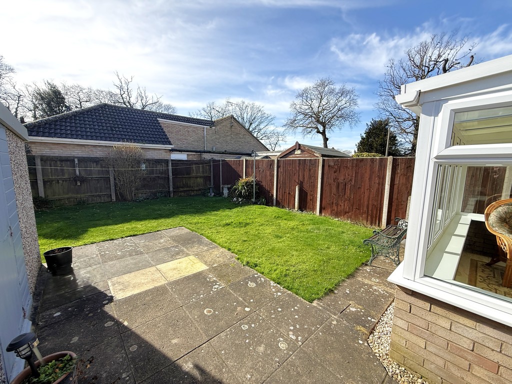 REAR Garden laid mainly to lawn and enclosed mainly by fencing with borders containing mature shrubs and plants. Paved patio area to the side of the conservatory and garage.