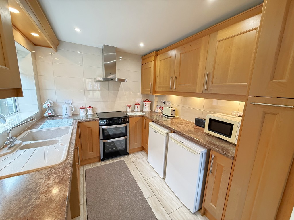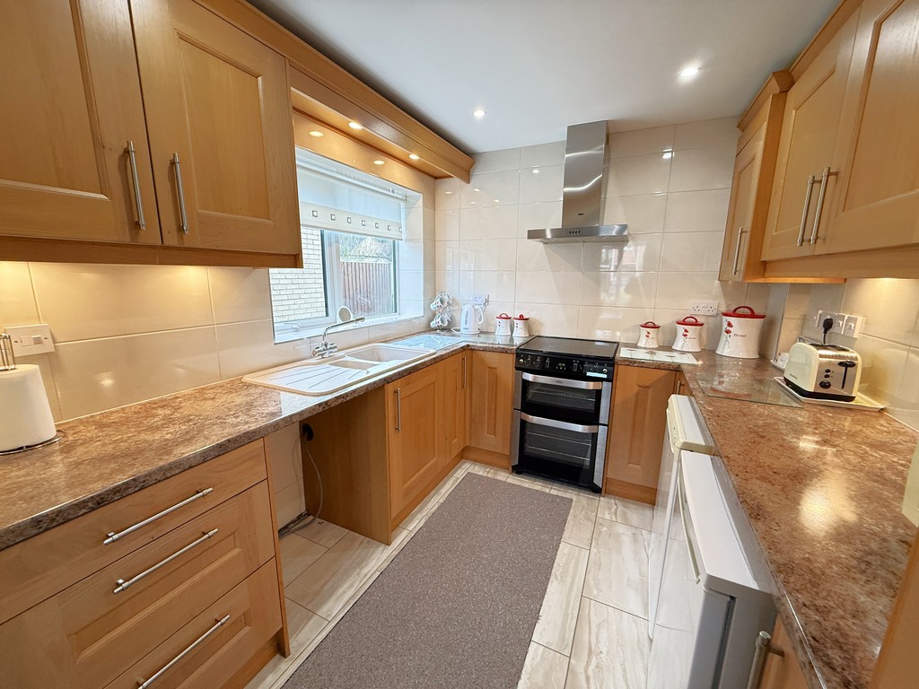 KITCHEN 9' 2" x 8' 1" (2.79m x 2.46m) Skimmed ceiling, with inset spotlights, tiled floor, power points, UPVC double glazed window to side, plumbing provision for washing machine. Range of matching wall and base units with round edge work surfaces over, tiled splash-backs, one and a half bowl composite sink unit with single drainer and mixer tap over, wall unit housing gas fired boiler supplying domestic hot water and radiators. Space for cooker with stainless steel extractor hood over, spaces for under-counter fridge and freezer.