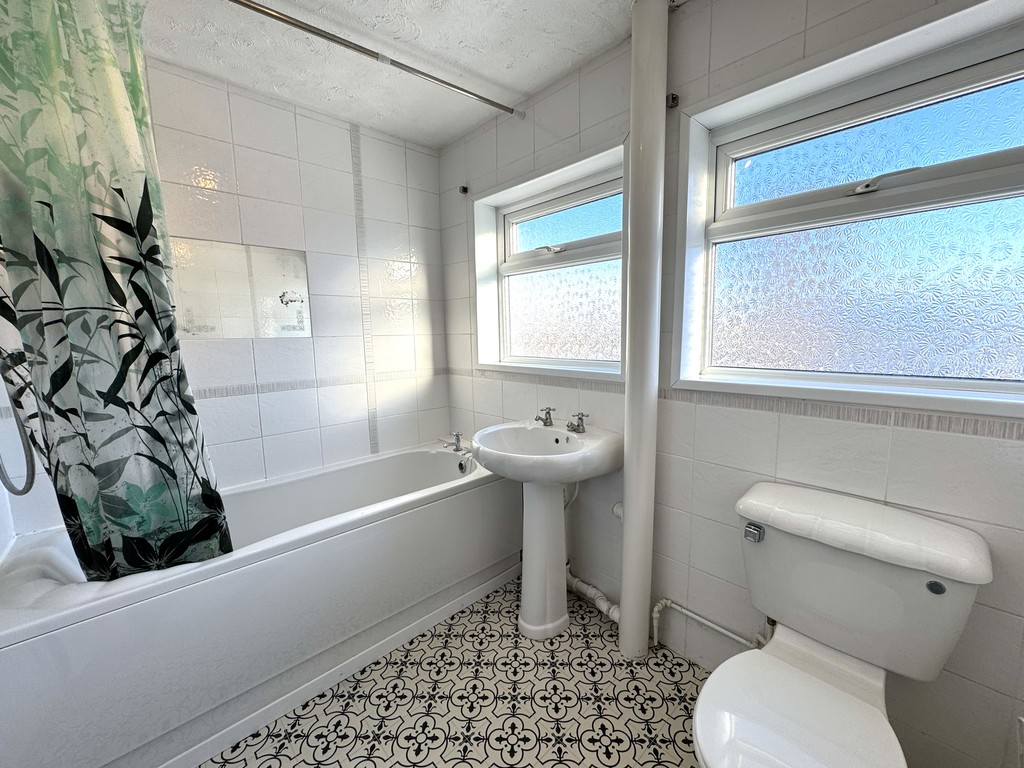 Bathroom 7' 9" x 5' 9" (2.36m x 1.75m) With low level WC, pedestal hand basin, panelled bath with thermostatic shower above & shower curtain rail, tiled walls, vinyl floor, radiator, 2 UPVC windows and shaver point.
