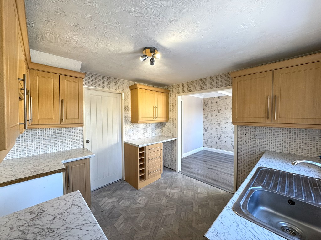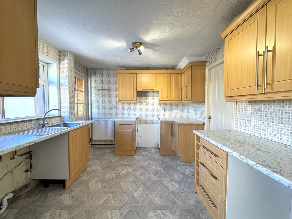 Kitchen 9' 10" x 9' 9" (3m x 2.97m) With fitted wall & base units, fitted worktops, stainless steel sink with drainer & monobloc tap, wine rack, point & space for a freestanding electric cooker with extractor above, plumbing & space for a washing machine, tiled surrounds, vinyl floor, radiator, UPVC window to rear aspect & door to rear lobby/store.
