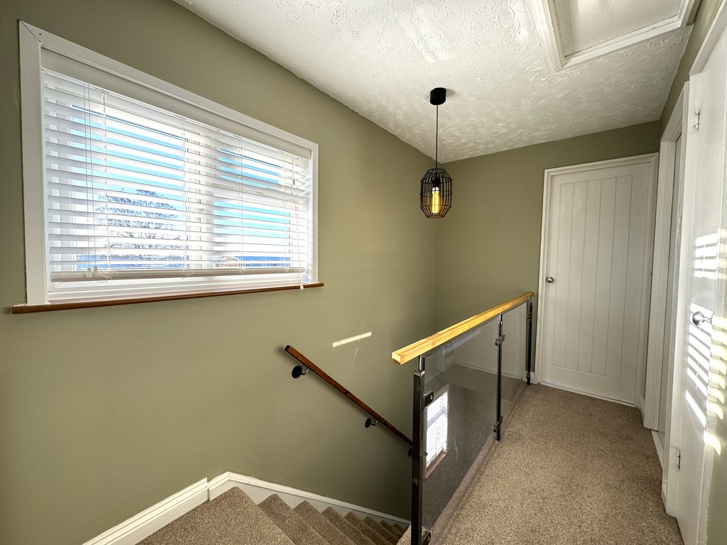 First Floor Landing With UPVC window, metal framed balustrade with glazed inserts and loft hatch. Airing cupboard housing hot water cylinder and programmer.