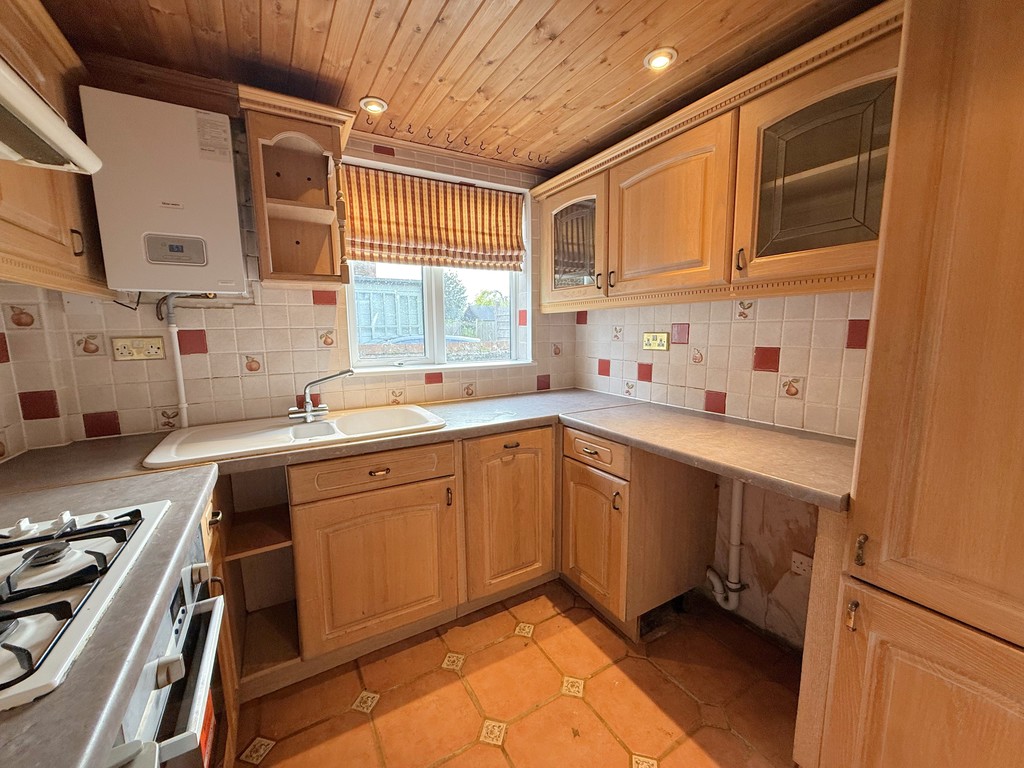 Kitchen 8' 1" x 7' 1" (2.46m x 2.16m) With fitted wall & base units, laminate worksurfaces, ceramic 1½ bowl sink with drainer & monobloc tap, integrated electric oven, 4 ring gas hob with extractor above, space for an undercounter fridge/freezer, plumbing & space for a washing machine, wall mounted gas boiler, tiled floor, tiled surrounds and panelled ceiling with inset spotlights.