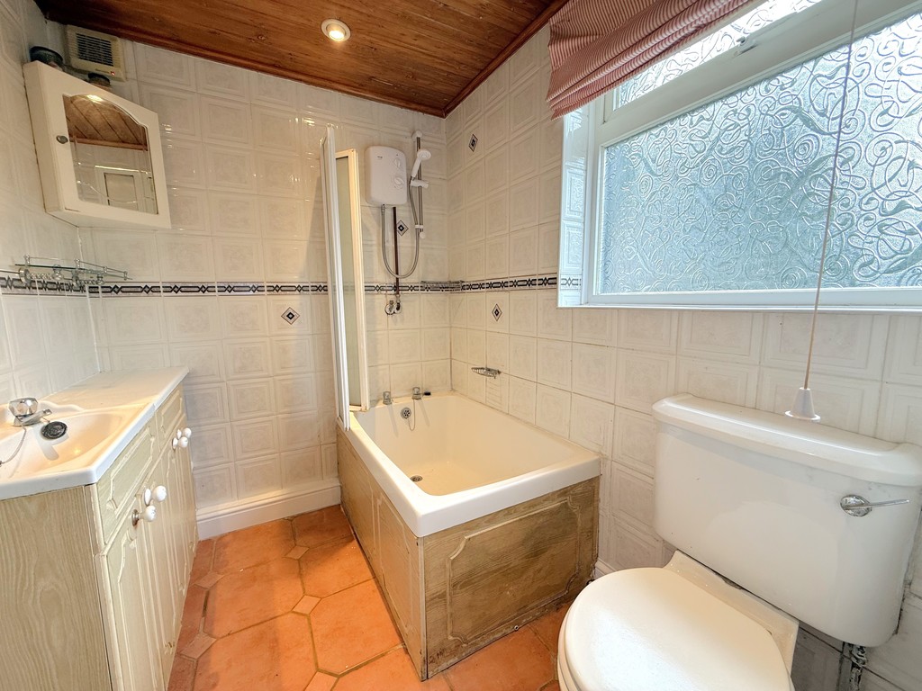 Bathroom 6' 9" x 5' 5" (2.06m x 1.65m) With low level WC, hand basin inset with cupboards beneath, panelled bath with electric shower above & folding glazed screen, tiled floor, tiled walls, extractor, radiator and panelled ceiling with inset spotlights.
