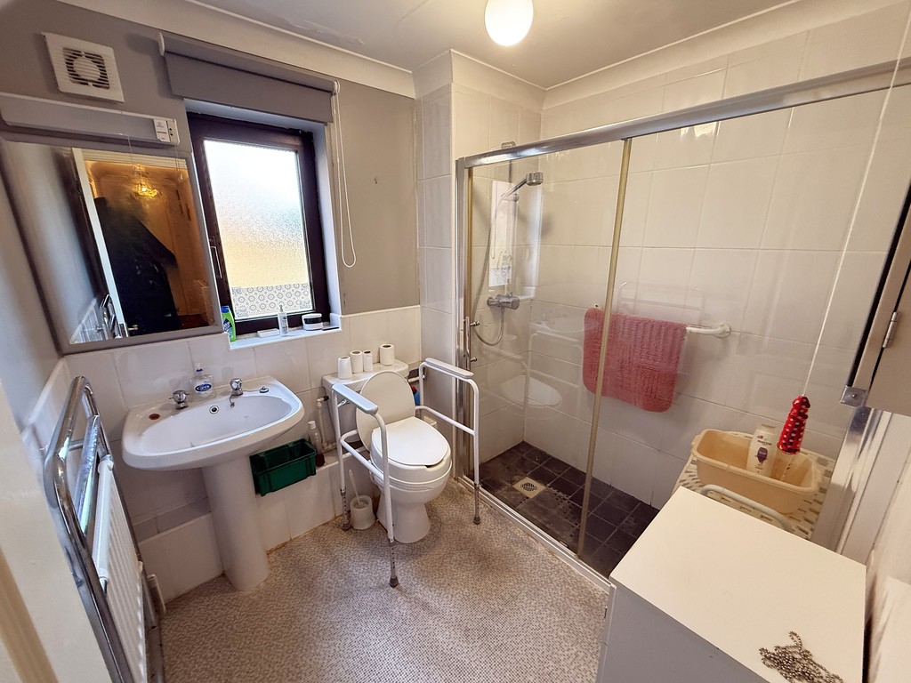 SHOWER ROOM 7' 5" max x 6' 5" max (2.26m max x 1.96m max) Skimmed and coved ceiling, vinyl floor covering, wall extractor, light/shaver socket, chrome heated towel rail, double glazed aluminium window to side. 1640mm wide shower cubicle with full height tiled surround and fitted system mixer shower, pedestal wash hand basin with tiled splash-back, low level WC with tiled splash-back.