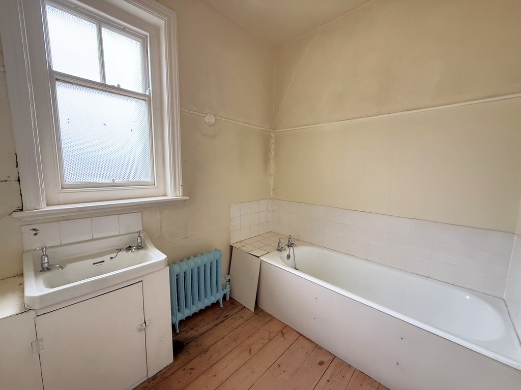 BATHROOM 7' 10" x 6' 10" (2.39m x 2.08m) Sash window to side, exposed wood flooring, cast iron radiator. Suite comprising; panelled bath with tiled splash-back, wash hand basin with tiled splash-back and cupboard under.