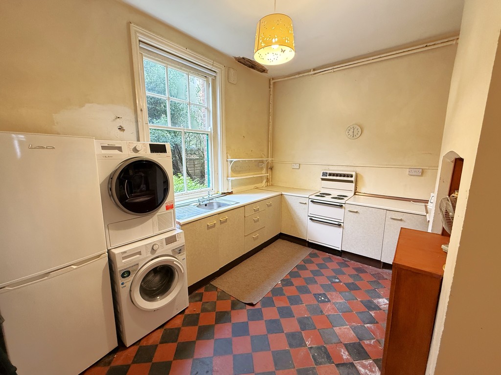 KITCHEN 13' 5" x 10' 5" max (4.09m x 3.18m max) Chequer patterned quarry tiled floor, power points, sash window to side, plumbing provision for washing machine. Range of base units with round edged work surfaces over, stainless steel sink unit with single drainer, space for cooker, space for fridge freezer. Door to:-