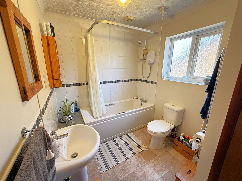 BATHROOM 6' 8" min opening to 9' 11" max x 6' 11" max (2.03m min opening to 3.02m max x 2.11m max) Textured and coved ceiling, ceiling extractor, vinyl floor covering, shaver socket, single radiator, chrome heated towel rail, UPVC double glazed window to side, airing cupboard housing hot water cylinder. Suite comprising; panelled bath with full height tiled splash-back and fitted electric shower, pedestal wash hand basin, low level WC.