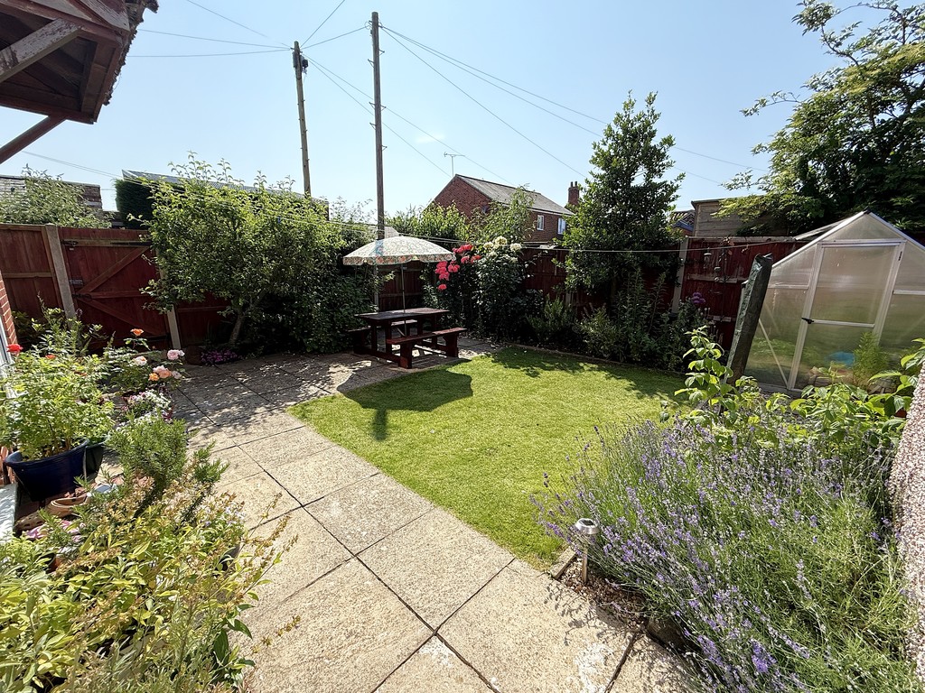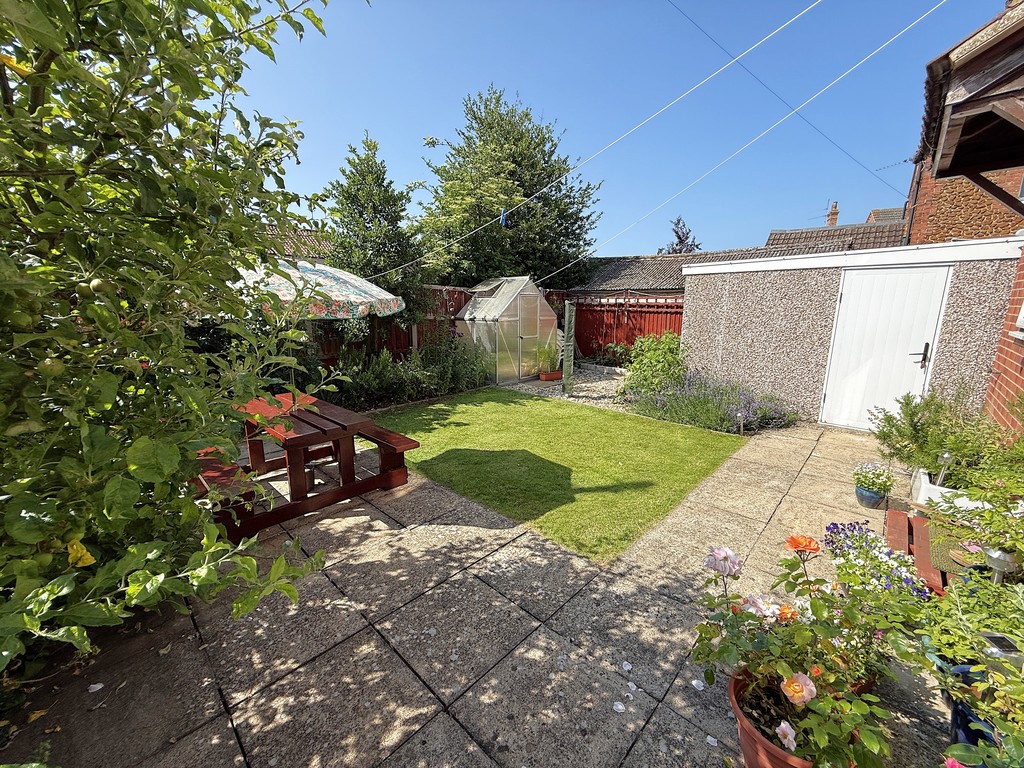 REAR An enclosed garden laid to lawn and paved patio areas with borders containing mature shrubs and plants along with established apple and pear trees. Gravelled area behind the garage with vegetable and soft fruit borders. Gate giving pedestrian access at the side.