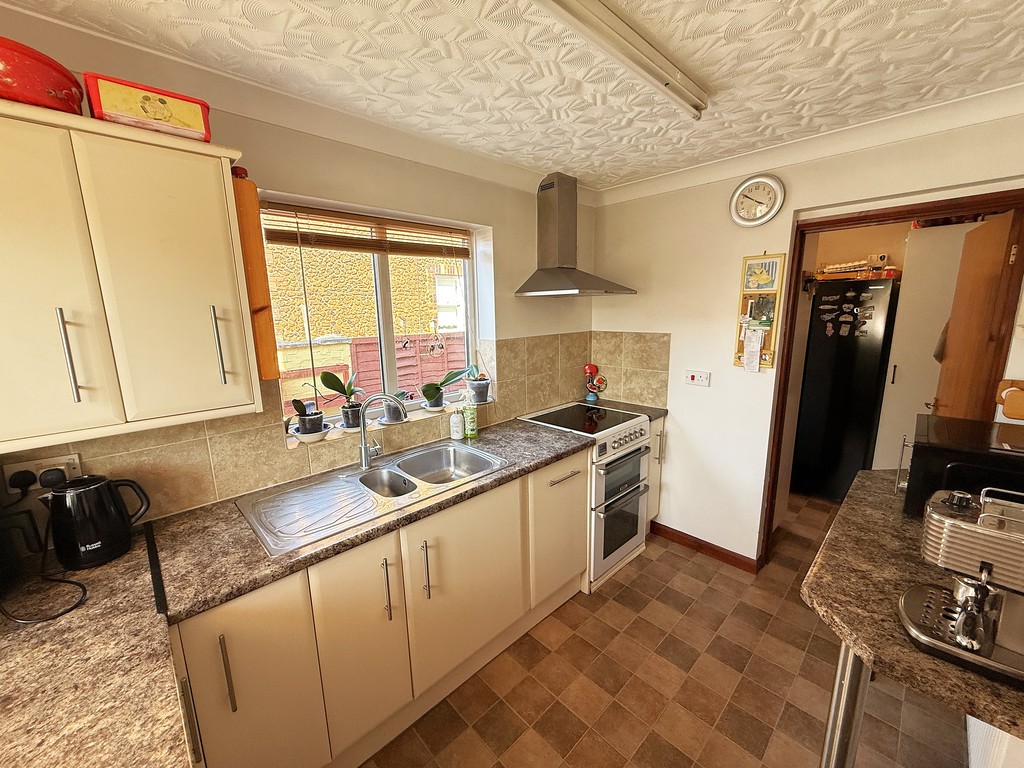 KITCHEN 10' 5" x 6' 11" (3.18m x 2.11m) Textured and coved ceiling, power points, single radiator, UPVC double glazed windows to the side and rear. Range of matching wall and base units with round edged work surfaces over, tiled splash-backs, one and a half bowl stainless steel sink unit with single drainer and mixer tap over, built-in dishwasher, space for cooker with stainless steel extractor hood over, space for under counter fridge. Door to:-
