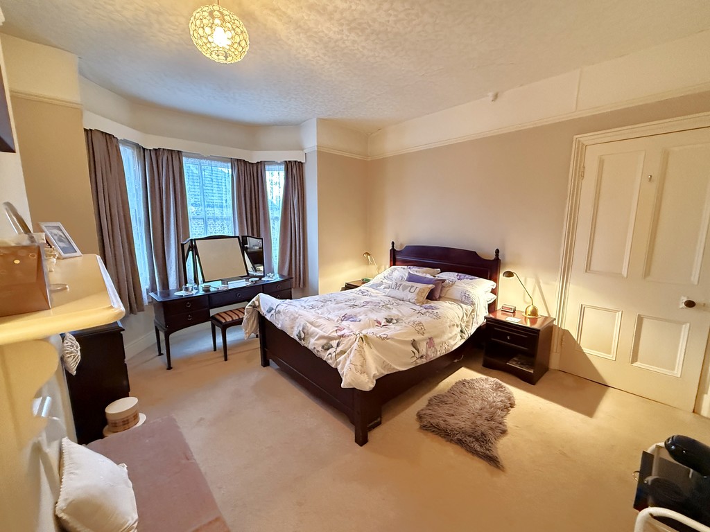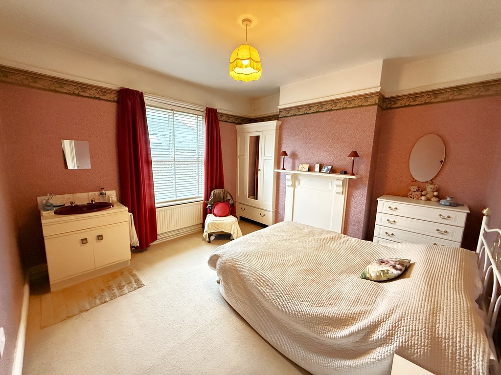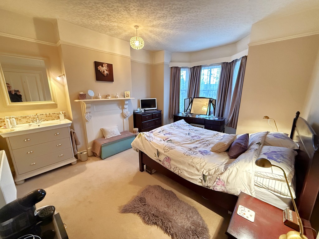 BEDROOM ONE 12' 1" min opening to 15' 1" max x 12' 2" max (3.68m min opening to 4.6m max x 3.71m max) Bay to front with double glazed sash window, power points, double radiator, feature former fireplace surround, large wash hand basin with tiled splash-back set on a vanity unit with drawers under.