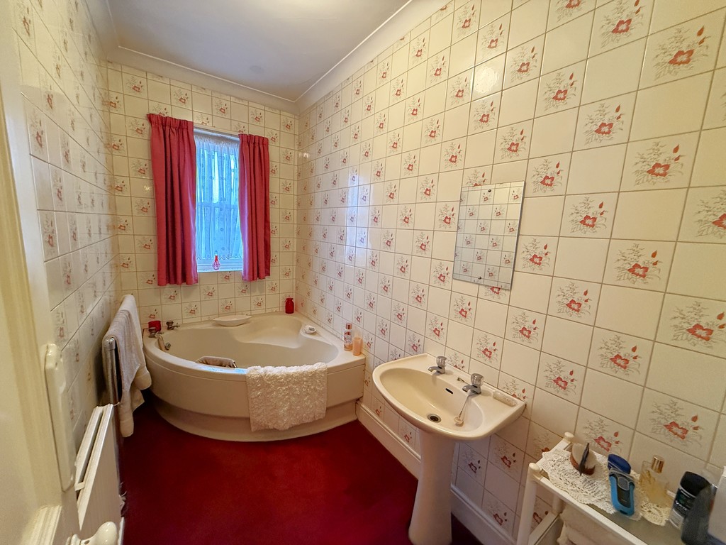 BATHROOM 10' 1" x 4' 11" (3.07m x 1.5m) Coved ceiling, full height ceramic wall tiling, window to rear, double radiator, heated towel rail. Suite comprising; corner panelled bath, pedestal wash hand basin.