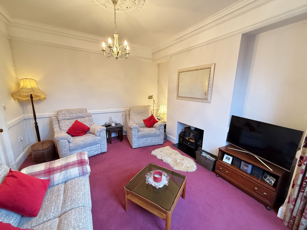 LIVING ROOM 12' 1" min opening to 15' 1" max x 12' 1" max (3.68m min opening to 4.6m max x 3.68m max) Moulded coving, central moulded ceiling rose, power points, television point, two double radiators, bay with double glazed sash window, fireplace recess with black granite effect hearth,