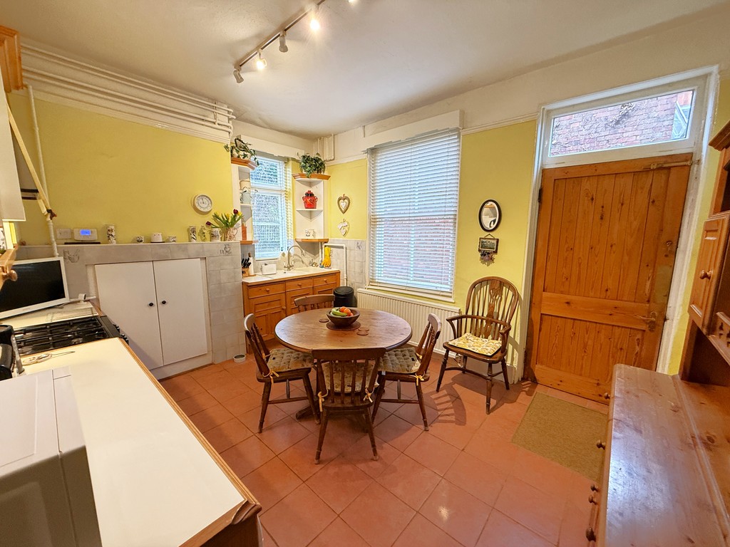 KITCHEN 12' 7" min opening to 14' 0" max x 11' 1" (3.84m min opening to 4.27m max x 3.38m) Tiled floor, sash window to side, window to rear, power points, double radiator, plumbing provision for dishwasher. Range of wall and base units with work surfaces over, tiled splash-backs, one and a half bowl composite sink unit with single drainer and mixer tap over, cupboard housing gas fired boiler supplying domestic hot water and radiators. Space for cooker with cooker hood set in a pull-out canopy over. Door to side. Door to:-