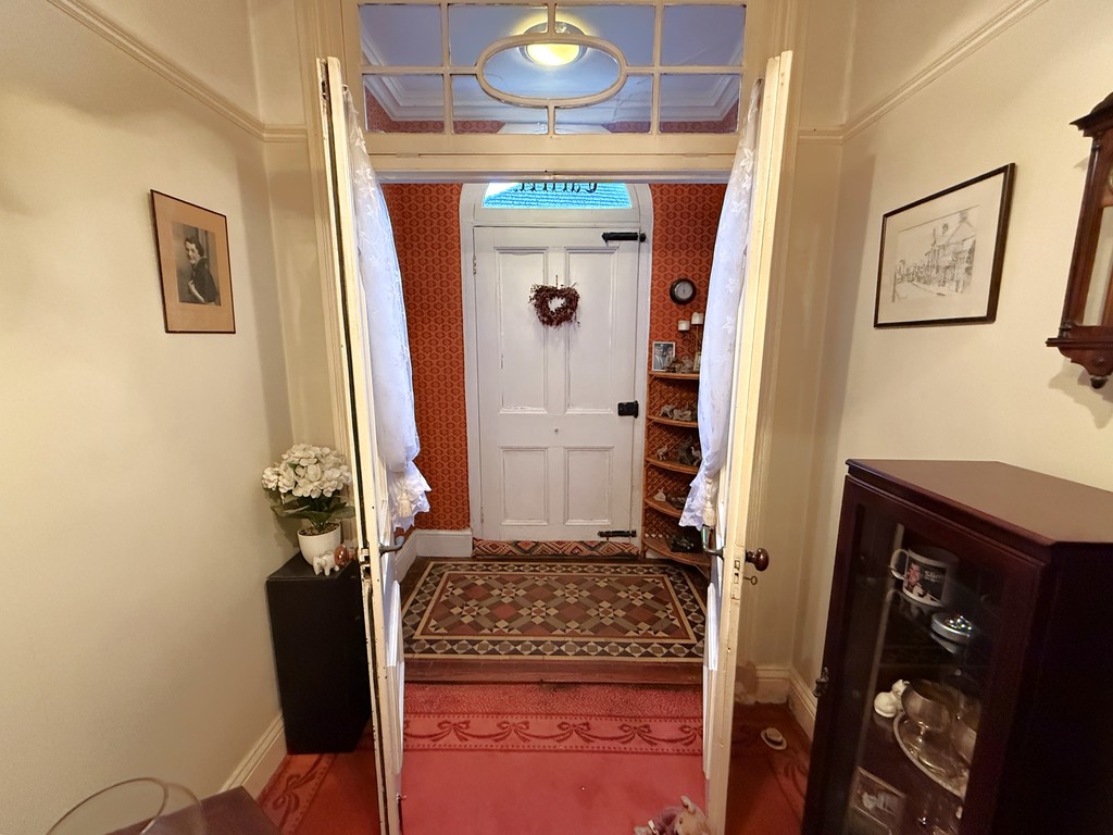ENTRANCE VESTIBULE 6' 6" x 3' 11" (1.98m x 1.19m) Moulded coving, original patterned tiled floor, glazed double doors with glazed overhead light to:-