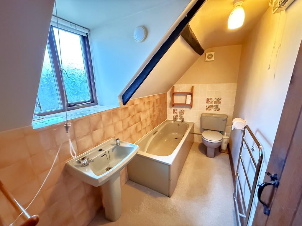 BATHROOM 9' 9" x 4' 9" (2.97m x 1.45m) (max room measurements excluding sloping ceiling) Skimmed ceiling, double glazed window to rear, wall extractor, chrome electric heated towel rail. Suite comprising; panelled bath with tiled splash-back, pedestal wash hand basin with tiled splash-back, low level WC.