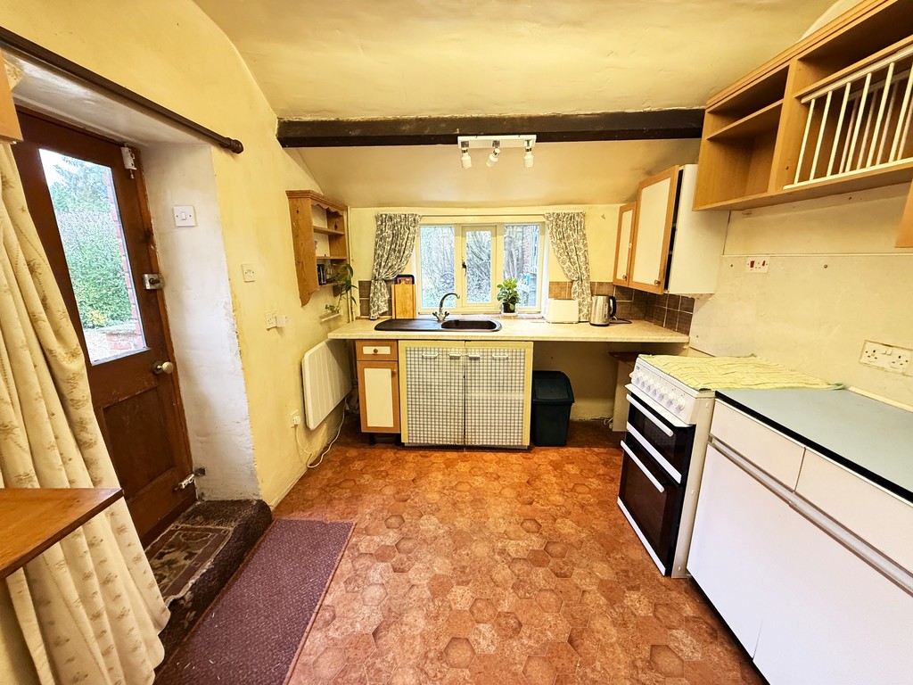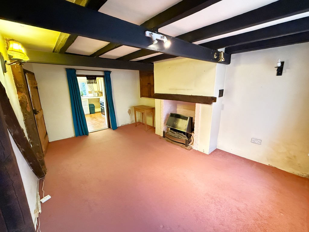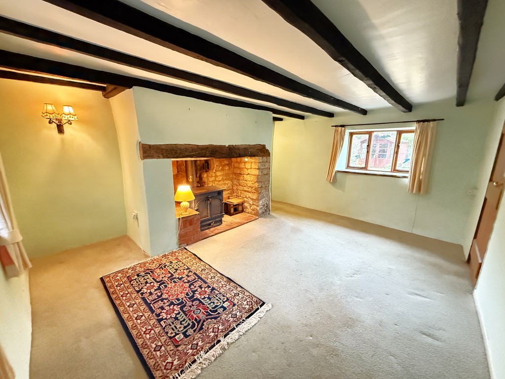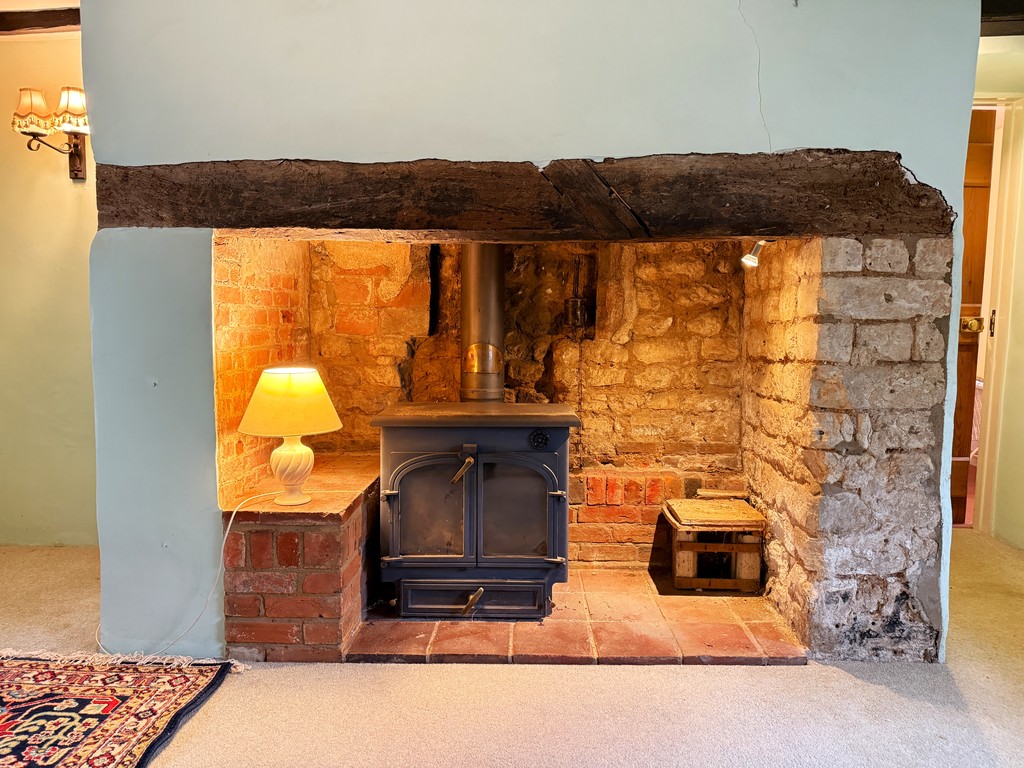 LIVING ROOM 15' 4" max x 10' 0" min opening to 13' 0" max (4.67m max x 3.05m min opening to 3.96m max) A double aspect room with double glazed windows to the front and rear, exposed ceiling beams, power points, feature inglenook fireplace with inset wood burner set on a quarry tiled hearth and timber bressummer over. Door to:-
