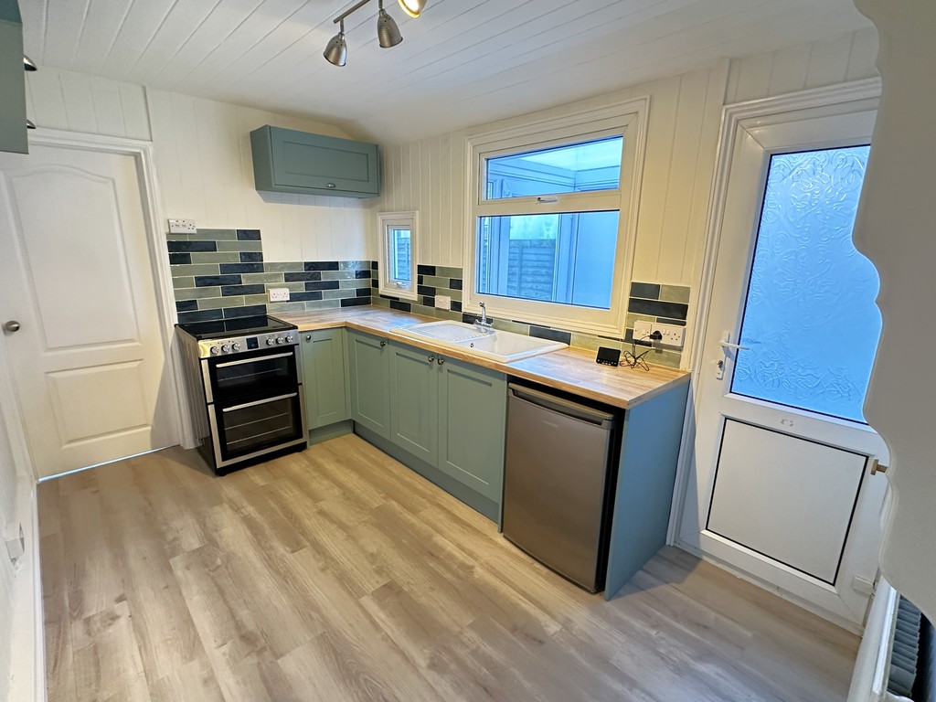 KITCHEN 11' 11" x 7' 11" (3.63m x 2.41m) Painted wood clad ceiling and walls, laminate flooring, power points, double radiator, UPVC double glazed windows to side. Range of matching base units with round edged work surfaces over, tiled splash-backs, ceramic sink unit with single drainer and mixer tap over, wall units. Space for free standing cooker and space for under counter fridge. UPVC double glazed door to side porch. Door to:-