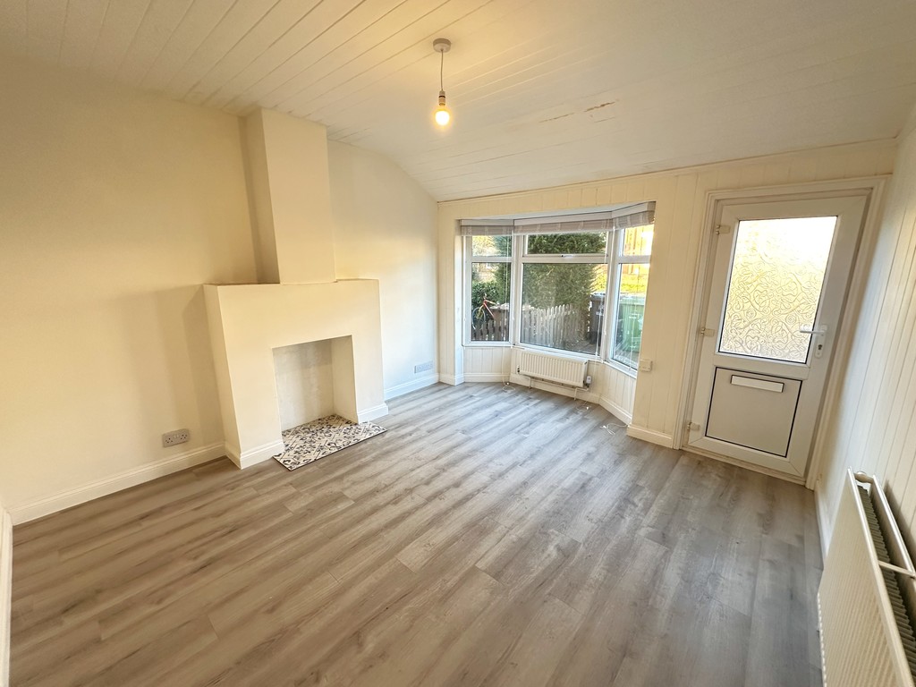 LIVING ROOM 13' 10" max x 11' 10" max (4.22m max x 3.61m max) Painted wood clad ceiling, laminate flooring, power points, two double radiators, UPVC double glazed bay window to front, ornamental fireplace recess. Door to:-