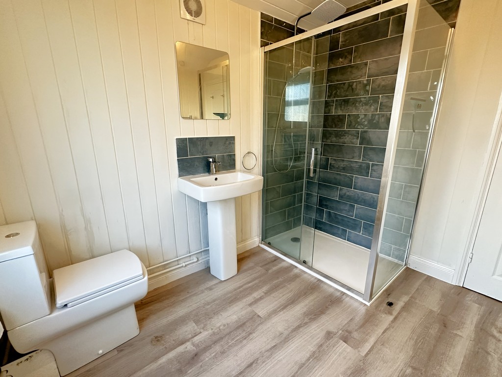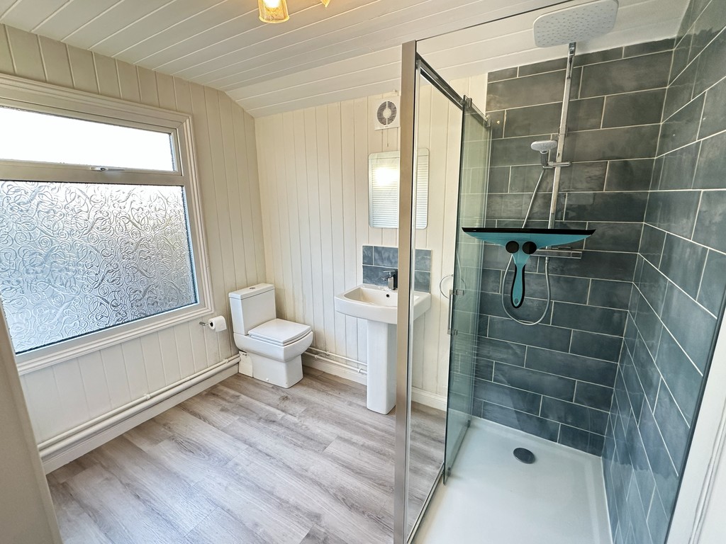 SHOWER ROOM 9' 0" max x 8' 0" max (2.74m max x 2.44m max) Painted wood clad ceiling and walls, wall extractor, laminate flooring, UPVC double glazed window to rear, airing cupboard housing gas fired boiler supplying domestic hot water and radiators, chrome heated towel rail. Suite comprising 1180mm wide shower cubicle with full height ceramic wall tiling and fitted system mixer shower, pedestal wash hand basin with tiled splash-back, low level WC.