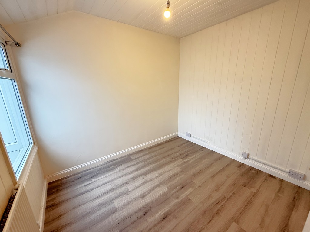 BEDROOM 10' 0" x 8' 8" (3.05m x 2.64m) Painted wood clad ceiling, laminate flooring, power points, single radiator, UPVC double glazed window to rear.